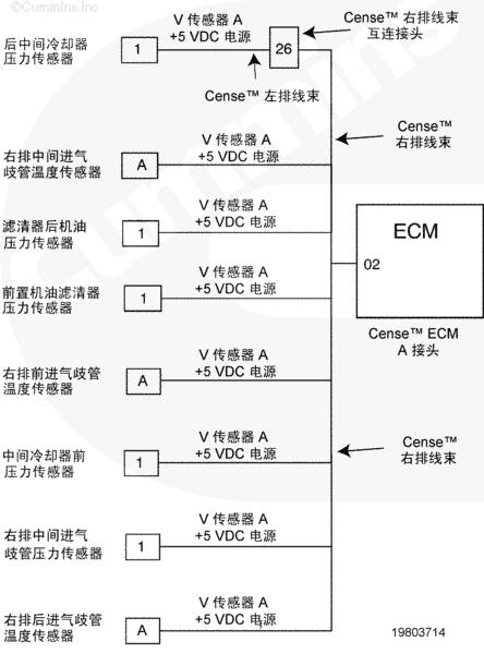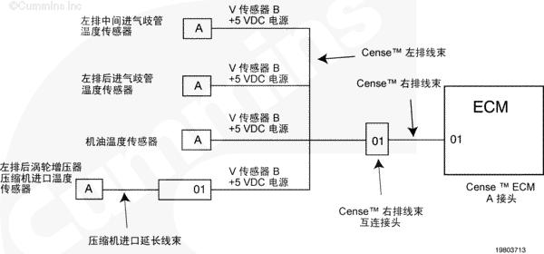 康明斯QSK78電子控制模塊 (ECM) 通過 CENSE™ ECM A 接頭上的觸針 02 向 CENSE™ 線束上的傳感器提供 +5 VDC 供電。當(dāng)一個大于 5 VDC 的電壓源短接到該電路圖時,所有連接到該傳感器的電源都會發(fā)生多個故障。發(fā)生這種情況是因為所有連接到該電源的部件信號電路圖電壓將上升到高于該部件的超出正常范圍(高壓短路)閾值。