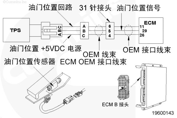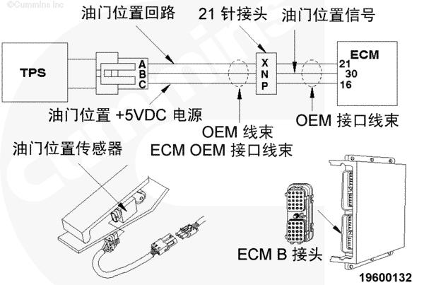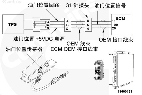 油門踏板通過 OEM 線束和 OEM 接口線束向 CM500 ECM 提供駕駛員油門指令。CM500 ECM 利用此信號來確定燃油油軌執(zhí)行器閥的供油指令。