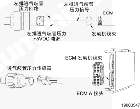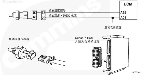 40 針 CENSE™ ECM A 接頭的觸針 01 上的傳感器電源“V 傳感器 B +5 VDC 電源”對地短路或者對回路電路圖短路。 |