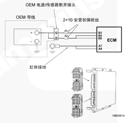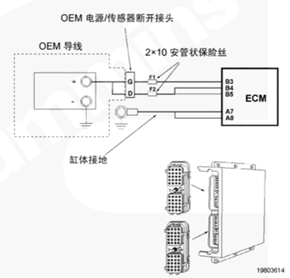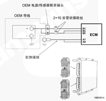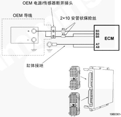 CM500 ECM 通過 OEM 線束和康明斯QSK78發(fā)動機線束接收無開關(guān)蓄電池電壓。OEM 接口線束的無開關(guān)蓄電池導(dǎo)線中有兩個個串聯(lián)式 10 安培保險絲,以保護 CM500 ECM。康明斯QSK78發(fā)動機線束中的蓄電池回路導(dǎo)線連至康明斯QSK78發(fā)動機缸體接地。