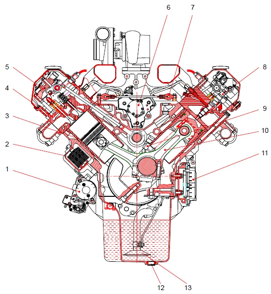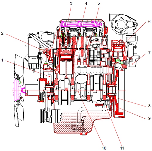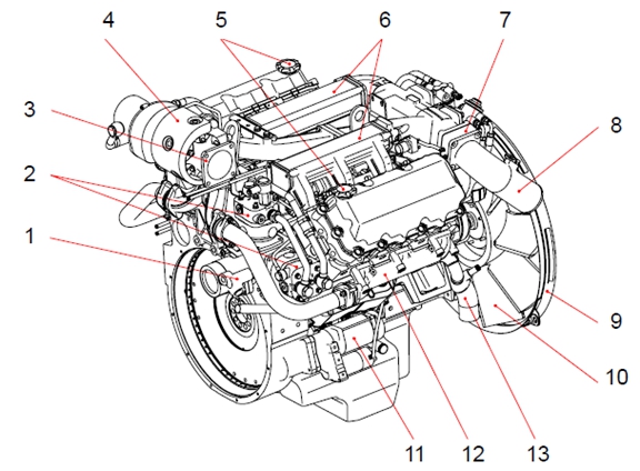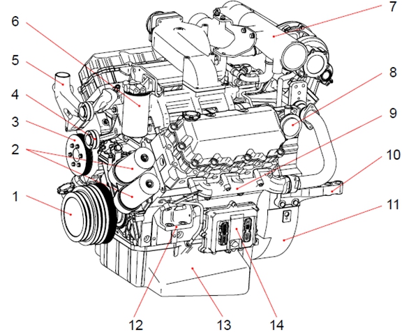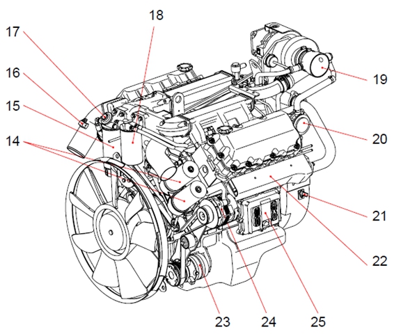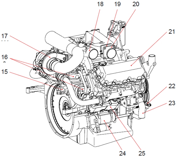1 曲軸皮帶輪 2 機油濾清器 3 冷卻水泵皮帶輪 4 惰輪 5 冷卻水出口 6 燃油濾清器 7 空氣管 8 呼吸器 9 排氣歧管 10 安裝支架(后) (渦輪增壓器到中冷器) 11 飛輪殼 12 安裝支架(前) 13 油底殼 14 電氣控制裝置(ECU) 15 動力轉向泵 16 空氣壓縮機 17 渦輪增壓器 18 空氣管 19 空氣加熱器(空氣濾清器到渦輪增壓器) 20 空氣管 21 氣缸蓋罩 22 加油口蓋 23 冷卻水入口 24 起動機 25 機油冷卻器