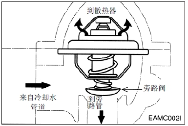 節 溫 器 保 持 冷 卻 液 的 固 定 溫 度 在(90∼95°C)并通過防止熱量損失來提高發動機熱效率。即當冷卻液溫度低時,節溫器閥門被關閉以使得冷卻液經旁路直接進入水泵。當冷卻液溫度升高到打開節溫器閥門時的溫度, 旁路被關閉,通住散熱器的水道被打開以便冷卻液受壓流入散熱器。