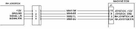 該診斷代碼與右操縱手柄前進和后退位置傳感器有關。 FMI 13 表示 ECM 已確定傳感器的信號不在預期限定范圍內(nèi)。
