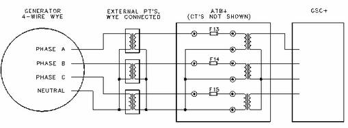 在四線 Y 形發電機上,除非完全持續的平衡掉負載,需要三個獨立的電壓互感器(PT's)來提高功率表的精度。 即使負載已經平衡,仍然不能確定一些 功率參數 GSC+顯示屏上沒有顯示這些參數:有效功率相位 A、B、C 和功率因數相位 A、B、C ATB+包括三個電壓互感器,以適應4 線 Y 形發電機。 當 4 線 Y 形發電機組使用一個開放三角形 PT 配置時,沒有利用ATB+的全部性能。