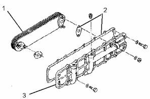 檢查濾芯(1)有無裂紋或其他缺陷。如果濾芯損壞,請更換濾芯。更換所有密封墊(2)并檢查機(jī)油冷卻器蓋(3)有無裂紋。如果機(jī)油冷卻器蓋損壞,請更換蓋。
