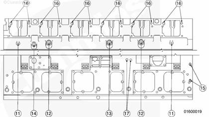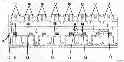 對缸體進行了改動以便能夠安裝較長的缸蓋螺釘。以前的康明斯發動機必須使用長度為 171 mm [6.73 in] 的螺釘?,F在的康明斯發動機必須使用長度為 203 mm [8.00 in] 的螺釘。短螺釘可用于維修。這些螺釘都是鍍鎘的(銀色或金色)。必須將這些短螺釘擰緊至 353 N•m [260 ft-lb]。如果短螺釘表面具有 lubrite 鍍層,而且顏色是黑色,則必須予以更換。203 mm [8 in] 螺釘只能使用 lubrite 鍍層。555 N•m [409 ft-lb] 扭矩必須施加在這些螺釘上。K50 康明斯發動機總是使用 203 mm [8.00 in] 螺釘。