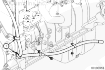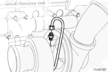 在供油管接頭上安裝渦輪增壓器供油軟管。供油軟管必須朝正下方,以便正確連接到機油濾清器座上的供油管接頭上。