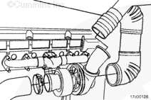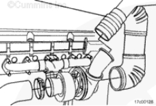 在空-空中冷器管接頭上安裝排氣彎頭和卡箍。在將彎頭安裝到渦輪增壓器上之前不要擰緊卡箍。