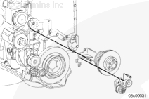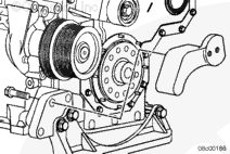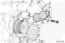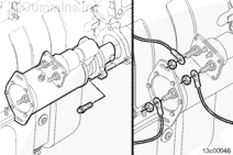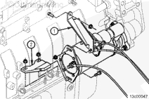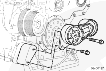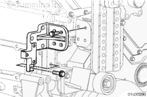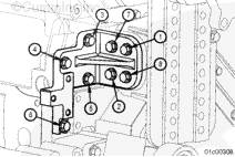 安裝渦輪增壓器防轉托架(如果配備)。端部靠在機油冷卻器殼上。此托架需要 1.25 mm [0.049 in] 加長螺釘。擰緊螺栓。