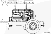 選用適當額定提升能力的吊車,將發動機提升工具(零件號 3162871)安裝到發動機吊耳上,以安裝發動機。
