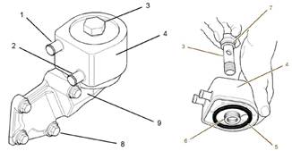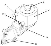 6.如有必要,拆卸調(diào)整螺釘(8)以從缸體拆卸機(jī)油冷卻器座(9)。從缸體上拆下接頭。棄置接頭。