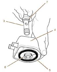 4.拆下調(diào)整螺釘(7)。從殼體(3)拆卸發(fā)動機(jī)機(jī)油冷卻器(2)和油封(5)。棄置油封(5)。