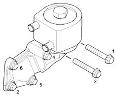 2.將發(fā)動機(jī)機(jī)油冷卻器(2)和新密封(5)放置在殼體(3)中。安裝調(diào)整螺釘(7),從而將發(fā)動機(jī)機(jī)油冷卻器(2)固定至殼體(3)。