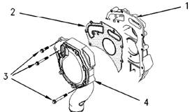 5.拆下水泵(4)。從前齒輪室(1)與水泵(4)上拆下接頭(2)。棄置接頭(1)。