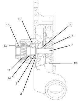 5.在一個(gè)合適的支架上支撐起水泵(3)殼體的機(jī)加工平面(10)。按壓軸(7)直至齒輪(11)和軸承(12)從軸上脫離。丟掉軸(7)和軸承(12)。通過(guò)水泵(3)殼體的側(cè)面,拆下齒輪(11)。