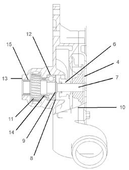 4.通過(guò)水泵(3)殼體的側(cè)面安裝齒輪(11)。使用一個(gè)適當(dāng)?shù)慕宇^,通過(guò)油封(14)將軸(7)按壓到齒輪(11)里。不斷向齒輪(11)里按壓軸(7),直至齒輪和水泵(3)殼體內(nèi)部齒輪的殼體頂部之間有一個(gè)1.5mm(0.060in)的間隙。