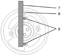 4.用頂部的“T”標記(8)對準皮帶輪,并且與發(fā)動機的中心線成一直線,然后在曲軸上安裝皮帶輪。使用一個合適的直尺(7)靠在導向銷(9)上,以協(xié)助皮帶輪的校準。