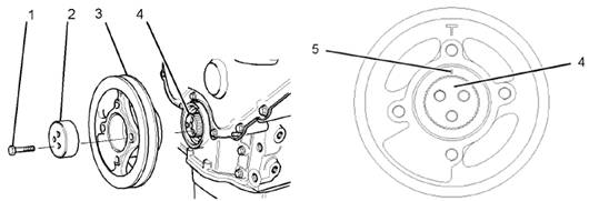 2.用曲軸(4)前面的標記對準皮帶輪(5)上的標記,然后在曲軸上安裝皮帶輪。
