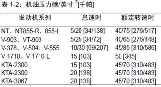 油溫在225°F[107°C]時的正常的發動機機油壓力列于表1-2中。