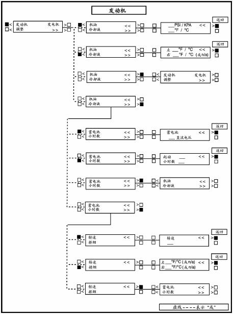 下一頁顯示了主功能和一些子功能的方框圖。如圖所示,主功能可進一步分為四個子功能。如果需要顯示發(fā)動機參數(shù),如機油壓力和機油溫度、水溫、發(fā)動機轉(zhuǎn)速(RPM)和排煙溫度等,按顯示屏上“ENGINE”(發(fā)動機)附近的按鍵,參考本章“ENGINEMEMU”(發(fā)動機功能)。