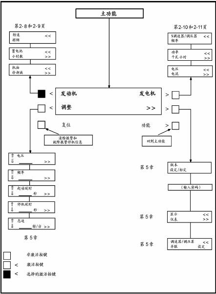 圖2-2給出了數(shù)字式顯示屏及其功能選擇鍵,請查閱前頁的“前端面板”關(guān)于功能顯示屏和按鍵的說明。當不起動發(fā)電機組在備用模式下操作和查看功能顯示屏時,按下然后釋放自我偵測鍵,這將會初始化PCC操作軟件,同時允許操作功能顯示面板,如果30秒內(nèi)沒有選擇任何功能,軟件定時器將會自動切斷電源。在接電模式下,控制盤一直帶電,顯示屏一直處于工作狀態(tài)。