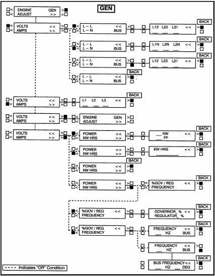 >”旁的按鍵將進到調(diào)速器/調(diào)壓器/頻率(%GOV/REG/FREQUENCY)子功能。選擇%GOV/REG(調(diào)速器/調(diào)壓器)以最大值的百分數(shù)顯示調(diào)壓器和調(diào)速器的調(diào)節(jié)開度;選擇FREQUENCY(頻率)顯示發(fā)電機的輸出頻率、母排頻率或系統(tǒng)的同步信息。在顯示調(diào)壓器/調(diào)速器或頻率參數(shù)的狀態(tài)下,按“<<”旁的按鍵顯示屏將回到(“BACK”)調(diào)速器/調(diào)壓器/頻率(%GOV/REG/FREQUENCY)子功能。