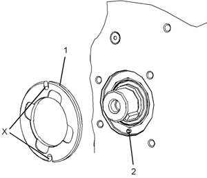 7用清潔的發動機機油潤滑止推墊圈。對齊止推墊圈(1)中的槽(X)與缸體中的定位銷(2)。將止推墊圈(1)安裝到缸體的凹槽中。