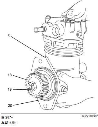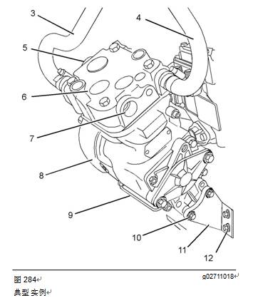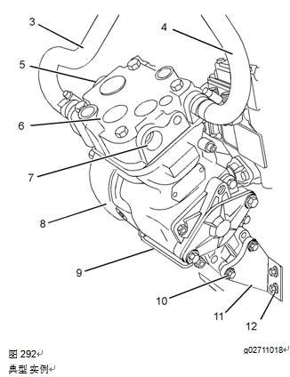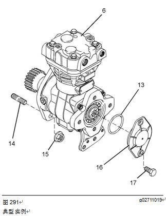 14.如果發動機在空氣壓縮機后部配備一個液壓泵,安裝該液壓泵。有關正確的步驟,請參閱OEM信息。