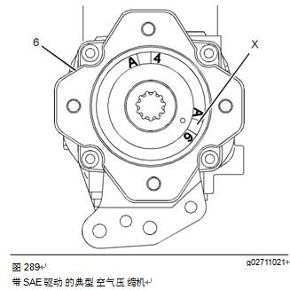 5轉動空氣壓縮機的曲軸,使正時標記(X)與空氣壓縮機(6)后表面上的正時標記A6對齊。有關帶SAE驅動的空氣壓縮機,請參閱圖289。有關帶DIN驅動的空氣壓縮機,請參閱圖290。