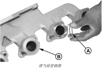 6. 用定位銷安裝帶墊圈(A) 的排氣歧管(B)。(參見第080 章的“拆卸、檢查和安裝排氣歧管”部分。)