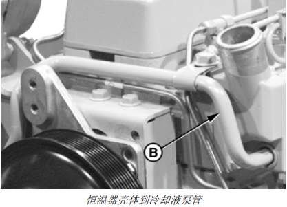 5. 安裝恒溫器殼體到冷卻液泵管 (B)。
