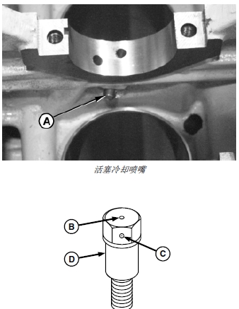 1. 拆卸并清洗每個活塞冷卻噴嘴 (A),確保冷卻噴嘴未堵塞或損壞。如果懷疑有問題,則應(yīng)更換。