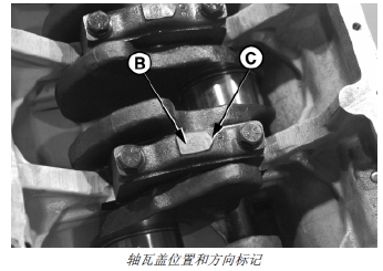 重要提示: 主軸瓦蓋一定要安裝在各自拆卸時的位置。軸瓦蓋上的數字 (B) 應與機體油盤架上的數字上合。裝軸瓦蓋上的箭頭 (C) 必須指向汽缸體凸輪軸一側。
