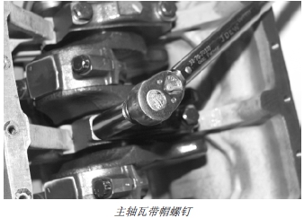 5. 對齊上下止推軸瓦,然后擰緊后主(止推)軸瓦帶帽螺釘。在曲軸和汽缸體加強筋間,用撬杠小心地將曲軸和主止推軸瓦蓋向后撬。然后,將曲軸向前移動使之與止推軸瓦表面對齊。