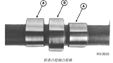 1. 在最高點 (A) 和最低點 (B) 分別測量每個凸輪緣。它們尺寸之間的差別就是凸輪軸凸輪緣高度。如果凸輪軸上任一凸輪緣的高度不符合技術規格的要求,應安