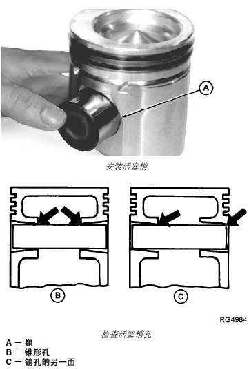 4. 插入活塞銷檢查銷孔是否對齊?;钊N不應發出“喀嗒”聲,或需要抵住另一端用力頂入孔內 (C)。
