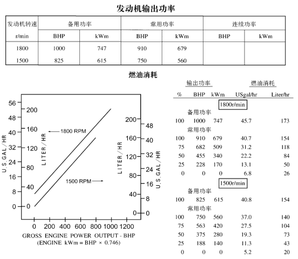 所有的數據均是基于發動機帶燃油泵、水泵、機油泵、空濾器和消聲器運轉時獲得的,但不帶有充電機、空壓機、風扇、選用設備和驅動件。所有的數據都是基于ISO 3046標準參考的條件—海拔110m(361ft),大氣壓力100kPa(29.53inHg),進氣溫度25℃ (77°F),相對濕度30%,使用標準No.2號柴油或符合ASTM D975的柴油。
