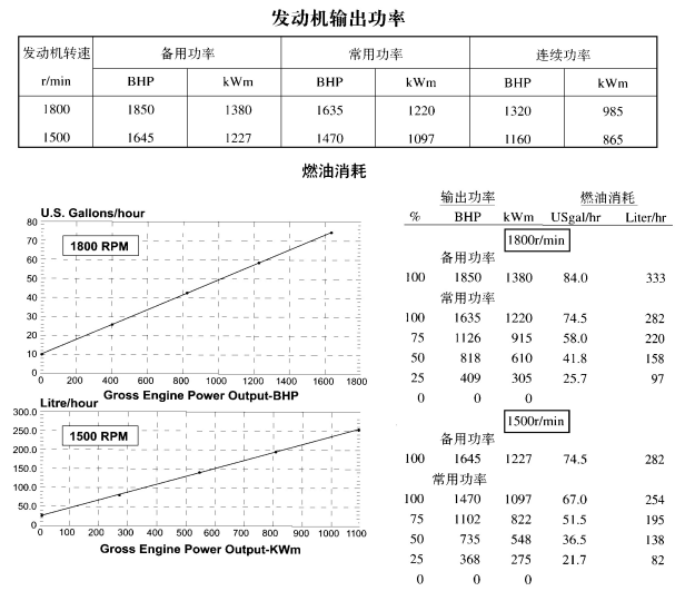以上所示發(fā)動(dòng)機(jī)性能數(shù)據(jù),是基于ISO 3046 標(biāo)準(zhǔn)規(guī)定的條件—海拔110m(361ft),大氣壓力100kPa (29.53inHg),進(jìn)氣溫度25°C(77°F),相對(duì)濕度30%,使用NO.2柴油或相當(dāng)于ASTM D2柴油的條件下得到的。 功率標(biāo)定使用準(zhǔn)則見《G-發(fā)動(dòng)機(jī)功率標(biāo)定使用準(zhǔn)則》。 油消耗數(shù)據(jù)是基于重度為0.85kg/l(7.1lbs/U.S.gal.)的NO.2柴油而得到的。 | |