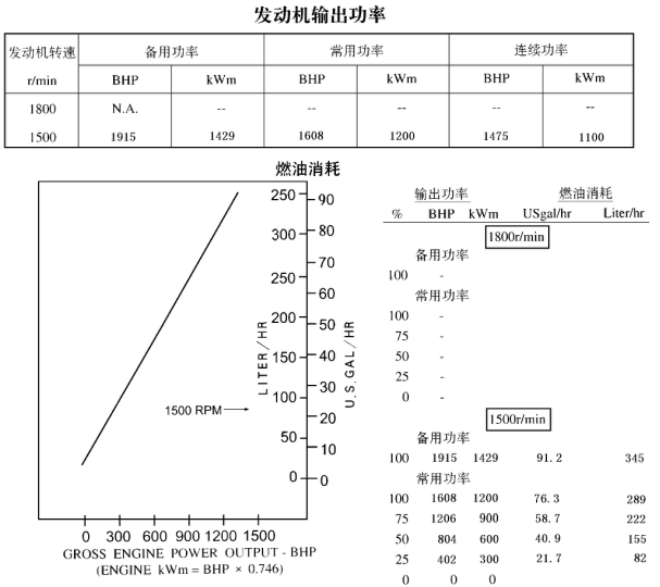 所有的數(shù)據(jù)均是基于發(fā)動(dòng)機(jī)帶燃油泵、水泵、機(jī)油泵、空濾器和消聲器運(yùn)轉(zhuǎn)時(shí)獲得的,但不帶有充電機(jī)、空壓機(jī)、風(fēng)扇、選用設(shè)備和驅(qū)動(dòng)件。所有的數(shù)據(jù)都是基于ISO 3046標(biāo)準(zhǔn)參考的條件—海拔110m(361ft),大氣壓力100kPa(29.53inHg),進(jìn)氣溫度25℃ (77°F),相對(duì)濕度30%,使用標(biāo)準(zhǔn)No.2號(hào)柴油或符合ASTM D975的柴油。