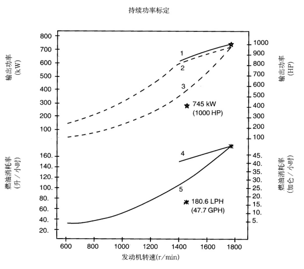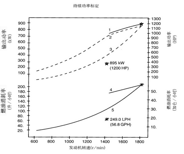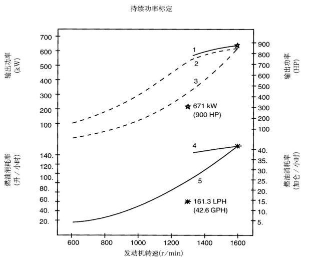 標定條件:功率標定是基于ISO8665標準規定的條件:大氣壓力為100kPa (29.612英寸汞柱),環境溫度為25℃(77°F),相對濕度為30%。螺旋槳軸功率為按97%扣除齒輪箱損失后的凈功率。燃油消耗是基于使用比重為838.9g/l(7.001磅/加侖),LHV為42780kJ/kW(18390Btu/lb)的35°API燃油。 1. 制動功率 kW(HP) 4. 軸功率對應的燃油消耗 2. 扣除齒輪箱損失后的軸功率 kW(HP) 5. 螺旋槳推進曲線對應的燃油消耗 3. 螺旋槳推進曲線 持續功率:這種功率標定的發動機允許在全負荷工況下連續不斷地使用。這種功率為ISO3046標準功率 * 對非LTA發動機,其燃油耗高1-3%。 | |||||||