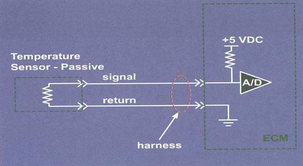下圖所示為溫度傳感器的工作原理。隨著溫度的升高,熱敏電阻值降低,從而使信號電壓降低,根據溫度傳感器的工作原理,可以用檢查熱敏電阻阻值的方法檢查溫度傳感器,通過對比實際測量所得的電阻值和參數表中的電阻值,即可判斷傳感器是否正常工作。