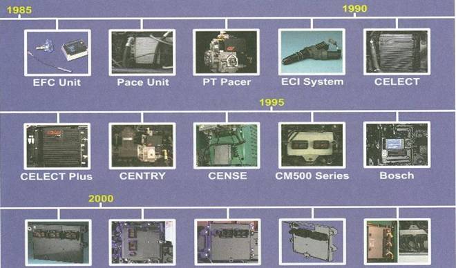 由于電控柴油機燃油系統的多樣性,康明斯有多種不同型號的ECU(M)用在不同型號的發動機上。下圖列出了不同年代在康明斯發動機上使用的ECU(M)。這些ECU(M)具有不同的零件號,在訂購時請注意。