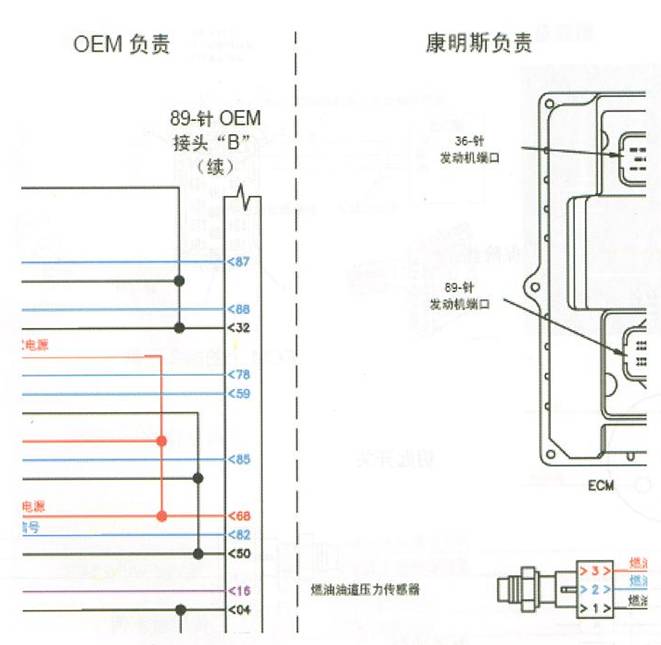需要指出的是,在實際的設備中,主機廠的電路連接不會完全和康明斯原裝電路圖中的接法一樣。這是因為康明斯電路圖中推薦的接法包含了發動機所有的特性,而主機廠在安裝時有些控制功能可能不啟用,或者在康明斯允許的前提下對電路作一定的改動。