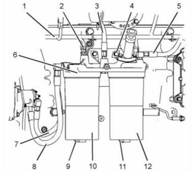 6. 使用帶1/2“方頭驅動的適當工具拆下燃油濾清器總成(10)和(12)。拆下O形密封圈。拆下燃油濾清器濾芯。有關更多信息,請參閱操作和保養手冊“燃油濾清器-更換”。