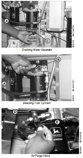 1. Drain water and contaminants from clear water separator sediment bowl (C) by opening drain valve (A), then operate hand primer (B) until bowl is clear of water and debris.