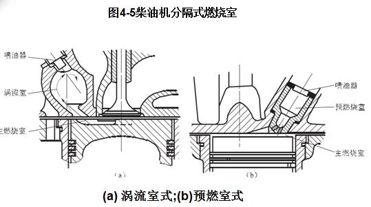 分隔式燃燒室由兩部分組成:一部分位于活塞頂與汽缸蓋底面之間,稱為主燃燒室;另一部分在汽缸蓋中,稱為副燃燒室。兩部分之間有一個或幾個孔道相連。分隔式燃燒室常見的形式有渦流室式和預燃室式兩種,如圖4-5所示。
