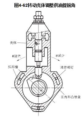 如圖4-62所示,泵體前端是三角形凸緣盤,其上開有三條弧形槽,用螺栓將其固定在驅(qū)動齒輪后面的箱體上。調(diào)整時,松開螺釘,轉(zhuǎn)動殼體,根據(jù)凸輪軸的驅(qū)動方向,逆凸輪軸轉(zhuǎn)向轉(zhuǎn)動殼體時,供油提前角變大;反之則減小。
