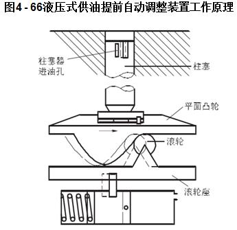在噴油泵處于靜止?fàn)顟B(tài)時,活塞在彈簧力作用下,被推向右側(cè)。當(dāng)柴油機工作后,泵內(nèi)燃油壓力升高。當(dāng)活塞兩邊失去平衡時,活塞開始向左移動,通過連接銷、撥銷推動滾輪座沿順時針方向轉(zhuǎn)動,即滾輪座相對于平面凸輪轉(zhuǎn)動,迫使平面凸輪提早頂起,供油提前角增大而使供油提前;反之,轉(zhuǎn)速降低,滾輪逆時針方向轉(zhuǎn)動,即滾輪座順著平面凸輪轉(zhuǎn)動,供油提前角減小而使供油滯后,如圖4-66所示。