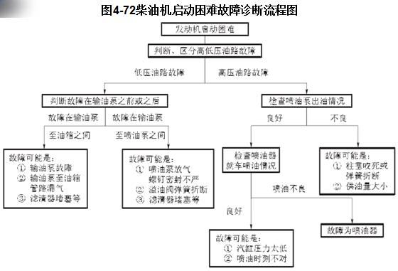 在進(jìn)行“發(fā)動機(jī)啟動困難”故障排除時,按照“檢查沃爾沃發(fā)動機(jī)噴油是否正常—檢查噴油是否正時—檢查汽缸壓縮壓力是否太低”的順序進(jìn)行。診斷流程如圖4-72所示。