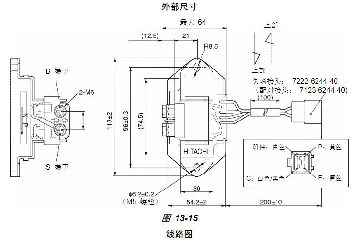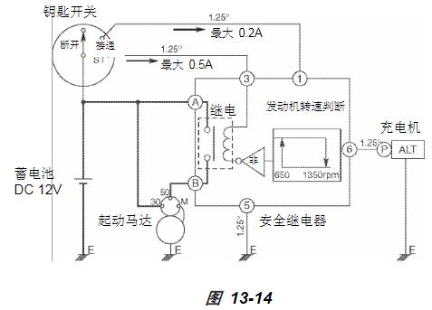 日立安全繼電器日立安全繼電器隨配備日立充電機(零件號 129136-77200)的發動機一起使用。充電機應有一個 P 端子。但是,這種安全繼電器只能兼容于不低于 12V/60A 的日立充電機。它與其它充電機不兼容。當充電機轉速超過 1400 ±120 min-1(環境溫度下)時,安全繼電器會切斷起動馬達電路。例如,當充電機皮帶輪與曲軸皮帶輪的傳動比為 0.6 時,起動馬達會在發動機轉速達到 840 ± 72 min-1時自動關閉。此后,意外操作鑰匙開關不能使起動馬達通電。接合后,安全繼電器會在充電機轉速達到不高于 498 min-1(環境溫度下)時斷開。例如,當皮帶輪傳動比為0.6 時,發動機轉速會達到不高于 299 min-1。由于普通發動機的低怠速轉速至少約為 800 min-1,安全繼電器起效一次后會在所有發動機轉速范圍下繼續起效。